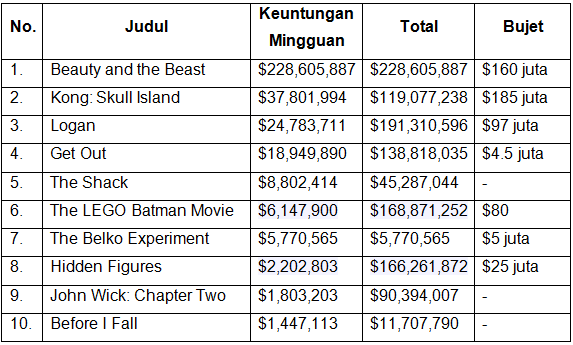 Minggu ini, Disney berjaya di puncak box office dengan Beauty and the Beast. Film garapan Bill Condon ini mencetak pendapatan yang fantastis, mencapai $228,605,887 pada minggu pertamanya. Sementara itu, Kong: Skull Island berada di posisi kedua dengan total pendapatan $119,077,238. Logan masih bertahan di posisi ketiga pda minggu ketiganya dengan pendapatan total mencapai $191,310,596.